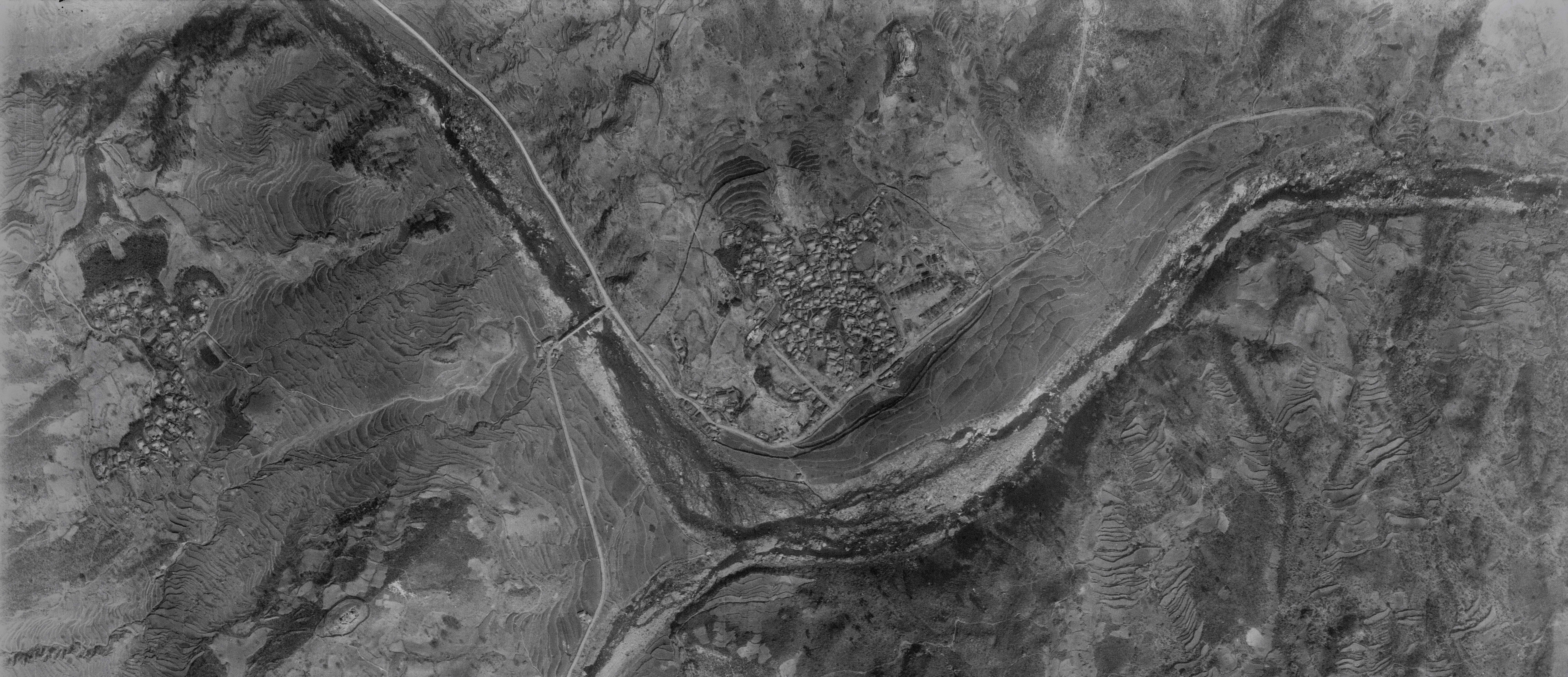 함양군 마천면소재지인 당흥마을의 1954년 항공사진이다. 사진을 확대해보면 마을 전체의 둘레에 방어선이 구축되어 있는게 보인다. 흔히 빨치산이라 부르는 공비들의 침입을 방어하기 위해서 구축된 것이다.